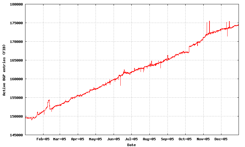 However the IPv4 trends for 2005 are a source of some concern. How big can the Internet grow in the coming years? Will we continue to be able to deploy routers in the default-free routing zone of the Internet that can comfortably route the Internet. Can we add additional functionality into the routing system and still stay within comfortable limits of the capability of the routing system and the routers? If you are an ISP and are considering purchasing new 'core' routers what capabilities should you specify for an operational lifetime of 2 years? How about for the next 5 years? And if you are a router vendor designing routing products for the market 3 or 5 years in the future what capacity should you build into the router? How much processing capacity should you plan for to support default-free BGP? How much memory is necessary?