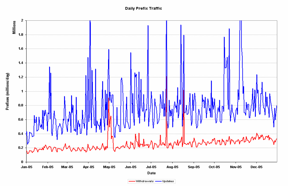 Date BGP Table Size Daily Prefix Updates Daily Prefix Withdrawals End 2005 176,000 700,000 400,000 End 2008 275,000 1,700,000 900,000 End 2010 370,000 2,800,000 1,600,000