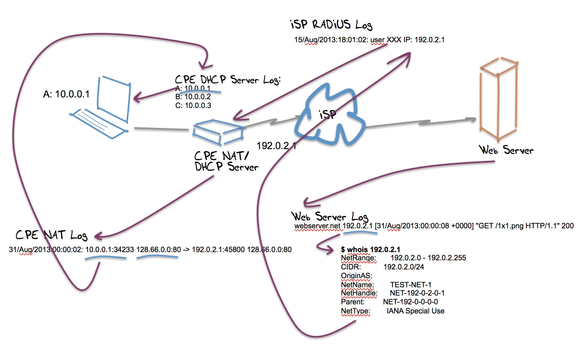 At this point the client side IP address can be used as a registry lookup key, and this will point to the provider. In the case where there is a CGN in the path, the next step in the traceback process is to use the connection profile of source and destination addresses and port numbers and the time value as a lookup into the carrier provider’s logs of the CGN bindings, and find the equivalent local IP address and port number that the CGN had used at the time for this connection. This local addresses is then used to look up the service provider’s Radius logs to find the customer who was assigned this local-side addresses, which then points to the customer.