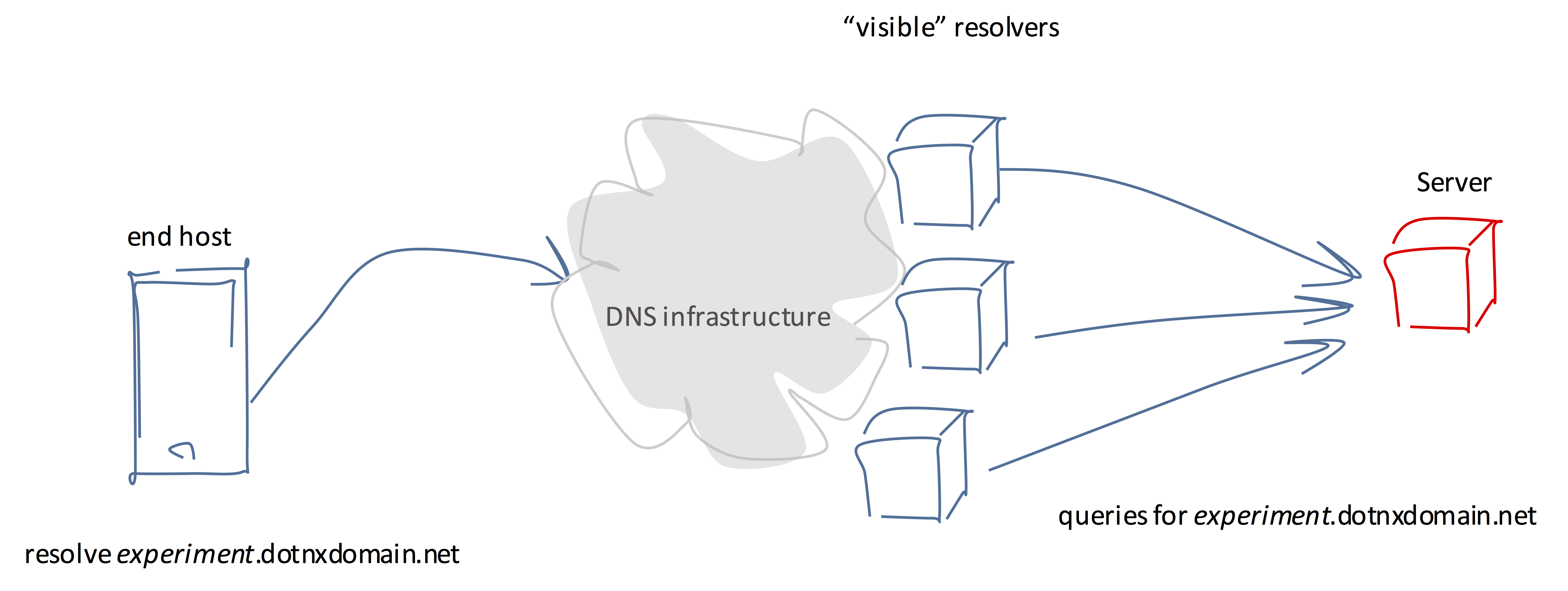 If we take the perspective of an authoritative name server, the DNS starts to look a lot like a fuzzy ‘cloud’ of semi-opaque behaviour (Figure 3). A user may have initiated a DNS transaction to resolve a name to an address, and the result is that one or more resolvers pose queries to the authoritative name server asking for the server’s information about this name (Figure 3). We will call these resolvers that are seen to pose queries to authoritative name servers “visible” resolvers. (From the perspective of the authoritative name server, the resolvers used by the client, and any intermediary forwarding resovlers are essentially hidden from the server.)
