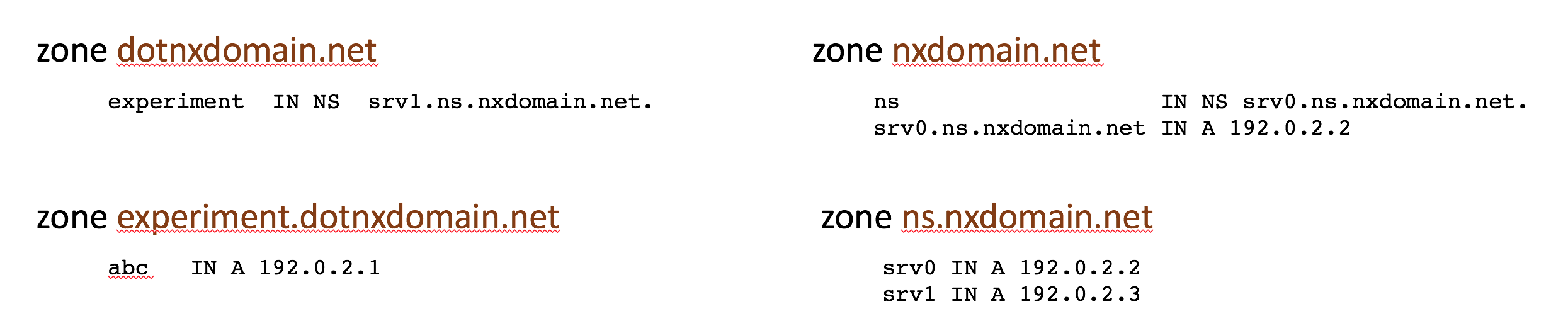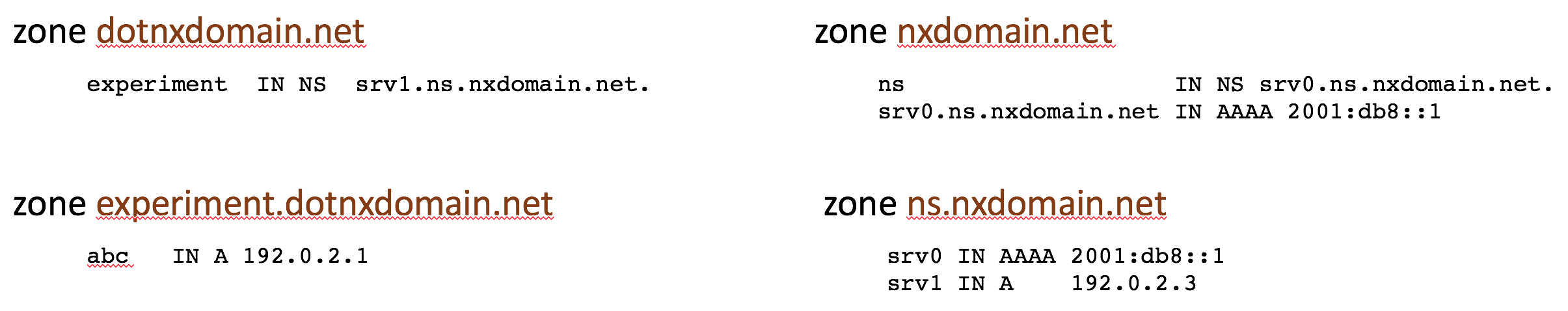 In order to resolve the name abc.experiment.dotnxdomain.net the resolver will query the name server for dotnxdomain.net and receive a response that indicates that the name experiment.dotnxdomain.net is a delegated domain and the name server of this delegated domain is srv1.ns.nxdomain.net., without any additional information providing the server’s IP address (as the delegation is “glueless”).