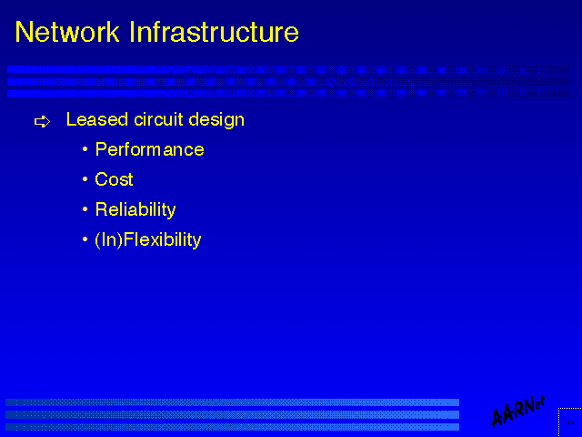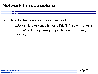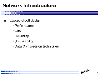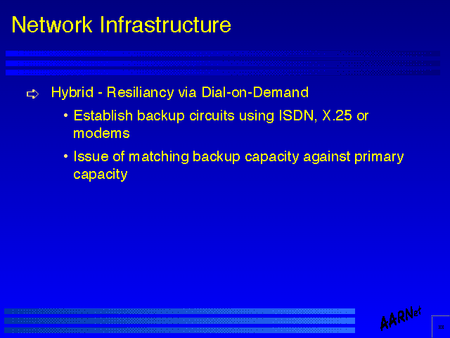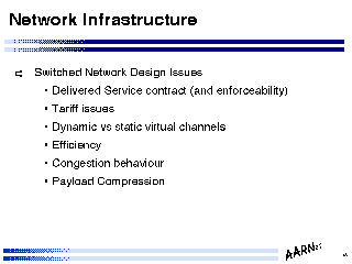 The issues associated with network design across shared switching infrastructure are somewhat different to dedicated circuit design issues. Within a switched infrastructure topology considerations are much less relevant as a design issue in so far as new circuits can be configured, and removed, with ease, and although current routers do not bring up a new circuit automatically (as this is typically a configuration issue which does entail additional expenditure the task is generally a manual configuration task as a consequence.