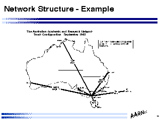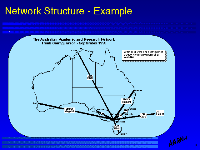Indicated in this figure is the topology of the Australian network engineered by the author, as of December 1993. The cost constraints, and the reliability factors of the circuits, routers and operational environments has allowed the network to be configured as a minimal spanning star trunk topology, feeding regional access hubs which are client connector points, using carrier provided leased dedicated circuits for the trunk network.