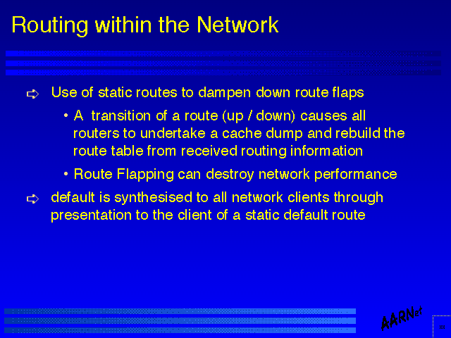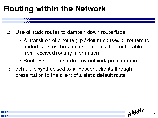 The judicious use of static routing techniques can be useful to dampen down the effect of line state transitions - the so called "route flapping" problem. Route transitions cause a dump of the cached routing tables in all routers, which in turn can impact on overall performance of the routing system. There are two ways in which route flapping can be damped.