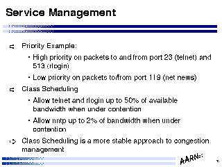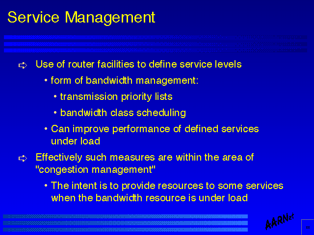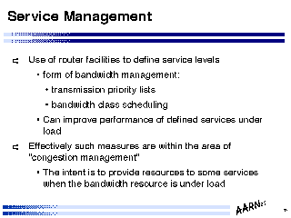 The point stressed here is that for such service definition to operate effectively all routers should be configured with the same service management configuration. It should also be noted that such management structures will not enforce service levels across the entire internetwork domain - where traffic is passed to other networks service management structures may differ, and overall end to end performance cannot be engineered unless all peer providers adopt a similar service class management structure.