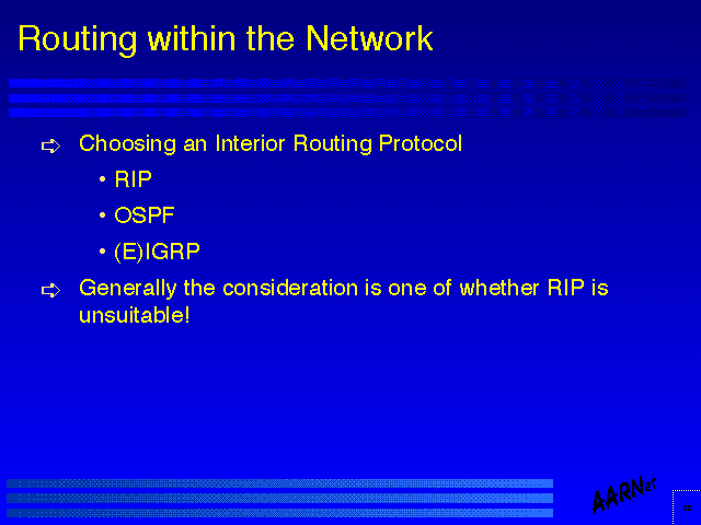 Here again the guideline of ultimate simplicity indicates that the starting point is to consider how and why RIP is unsuitable, and if there are no reasons, then RIP is a very suitable candidate from the perspective of simplicity and ease of use. RIP does have a number of problems which imply that the domain of applicability of RIP is a shrinking one. The constant issues of RIP include the time taken for a distance vector protocol to converge to a stable state in the face of either topology changes or external route presentation changes, and the high level of constant information exchange used by the protocol in the steady state (RIP's overheads are directly related to the number of routed entered and carried within the RIP protocol domain). In addition RIP has embedded notions of Class A, B and C networks, so that carrying around aggregated information (the so-called CIDR blocks) of network value and associated mask on a longest match basis is not readily possible within the RIP environment.