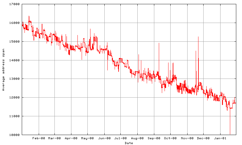 A similar observation can be made regarding the number of addresses advertised per AS. In December 1999 each AS advertised an average of 161,900 addresses (equivalent to a prefix length of /14.69, and in January 2001 this average has fallen to 115,800 addresses, an equivalent prefix length of /15.18.