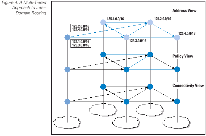 One observation about the current inter-domain routing system is that it uses a view of the network based on computing the optimal path to each address prefix. This view is translated into an inter-domain routing protocol that uses the address prefix as the basic protocol element and attaches various attributes to each address prefix as they are passed through the network.